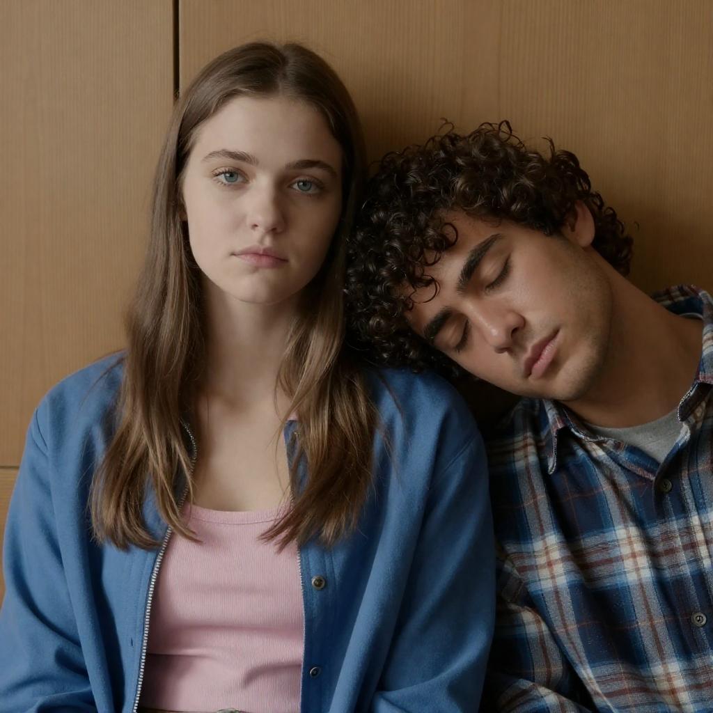 Photograph of a young woman with long brown hair and fair skin, wearing a blue jacket over a pink top, sitting against a wooden wall. A curly-haired man with a tan complexion, wearing a plaid shirt, rests his head on her shoulder, eyes closed. The woman looks forward with a neutral expression.