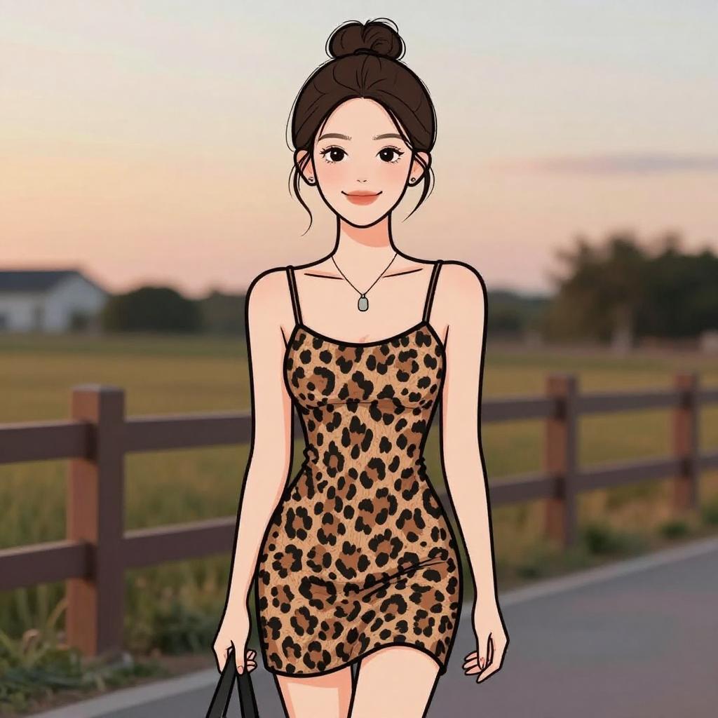 Digital illustration of an Asian woman with fair skin, black hair in a bun, wearing a tight, leopard-print, spaghetti-strap dress that accentuates her slender figure. She has a necklace with a small pendant and carries a black handbag in her right hand. She smiles softly, with pink lips and minimal makeup. The background features a blurred rural landscape with a wooden fence, green field, and a house in the distance under a pastel-colored sunset sky. The image has a smooth, cartoon-like style with clean lines and soft shading.