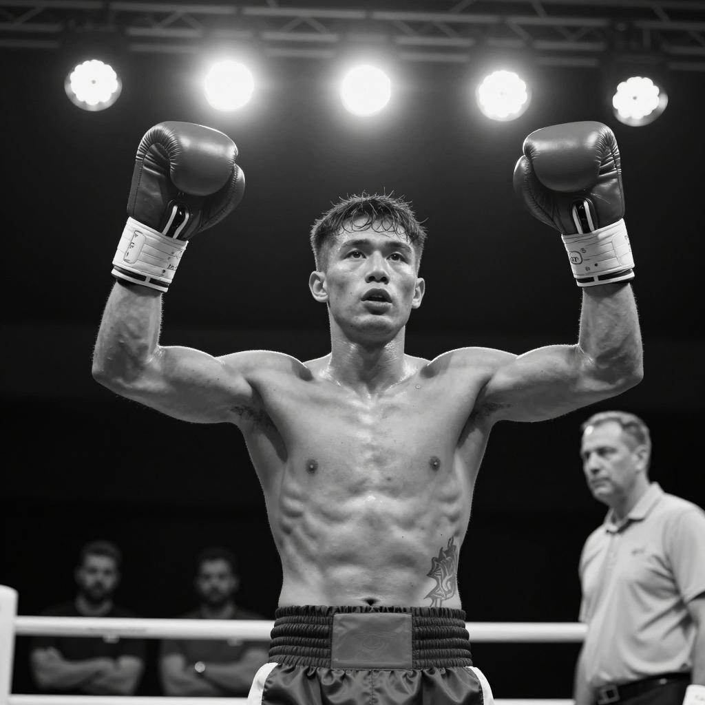 Two muscular male boxers in a dimly lit ring. One wears red gloves and orange-red shorts, the other wears red gloves and blue shorts with white stars. Both are mid-fight, fists raised, faces intense. Background features ring ropes and spotlights.