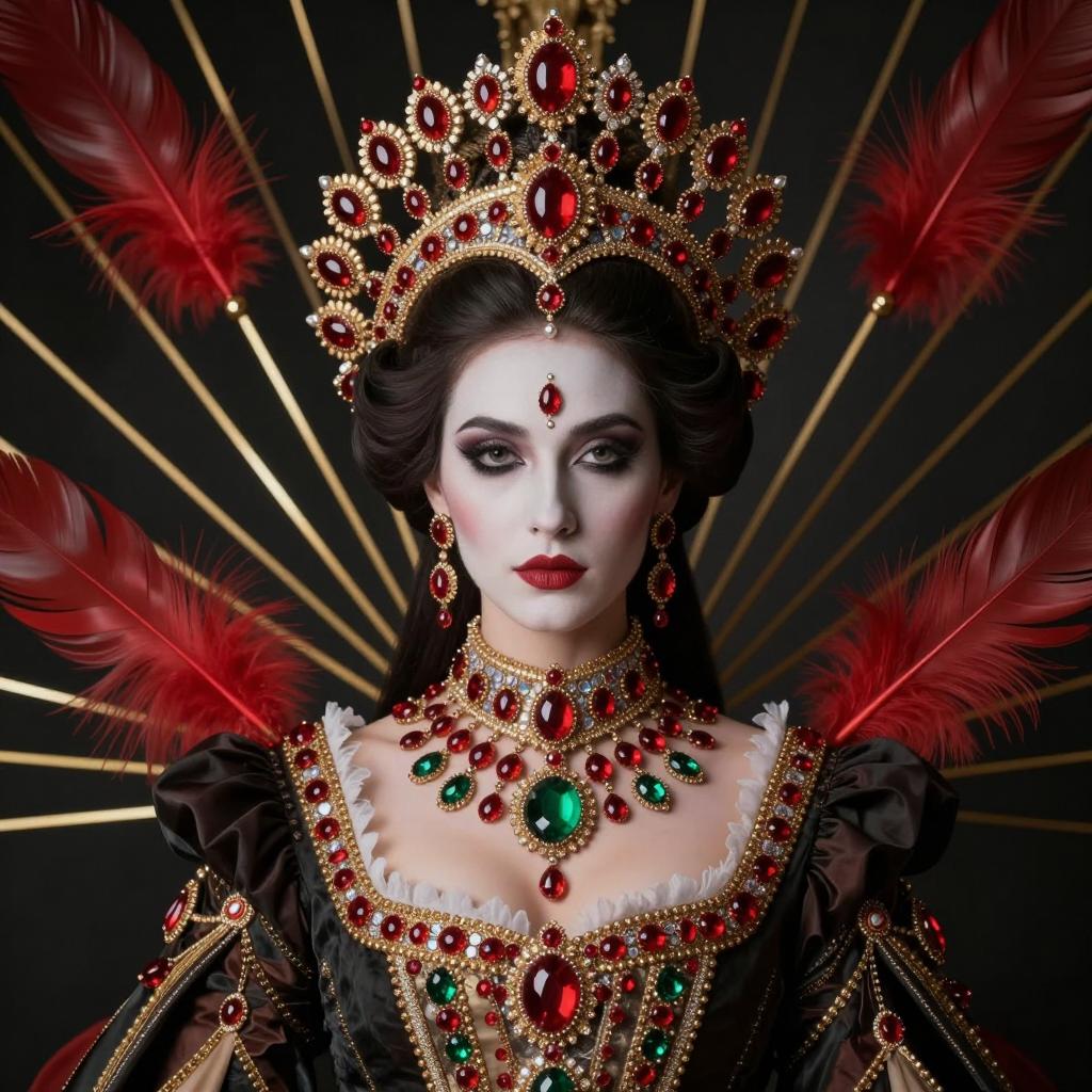 Portrait of a woman in elaborate Baroque-inspired fashion wearing a large ornate headdress adorned with red and gold jewels. She is dressed in a high-neck gown richly decorated with red and green gemstones. Her pale face features dramatic makeup including dark eyeliner, red lipstick, and a central red jewel on her forehead. The background is dark with radiating gold lines and red feathers, enhancing the regal and dramatic effect.