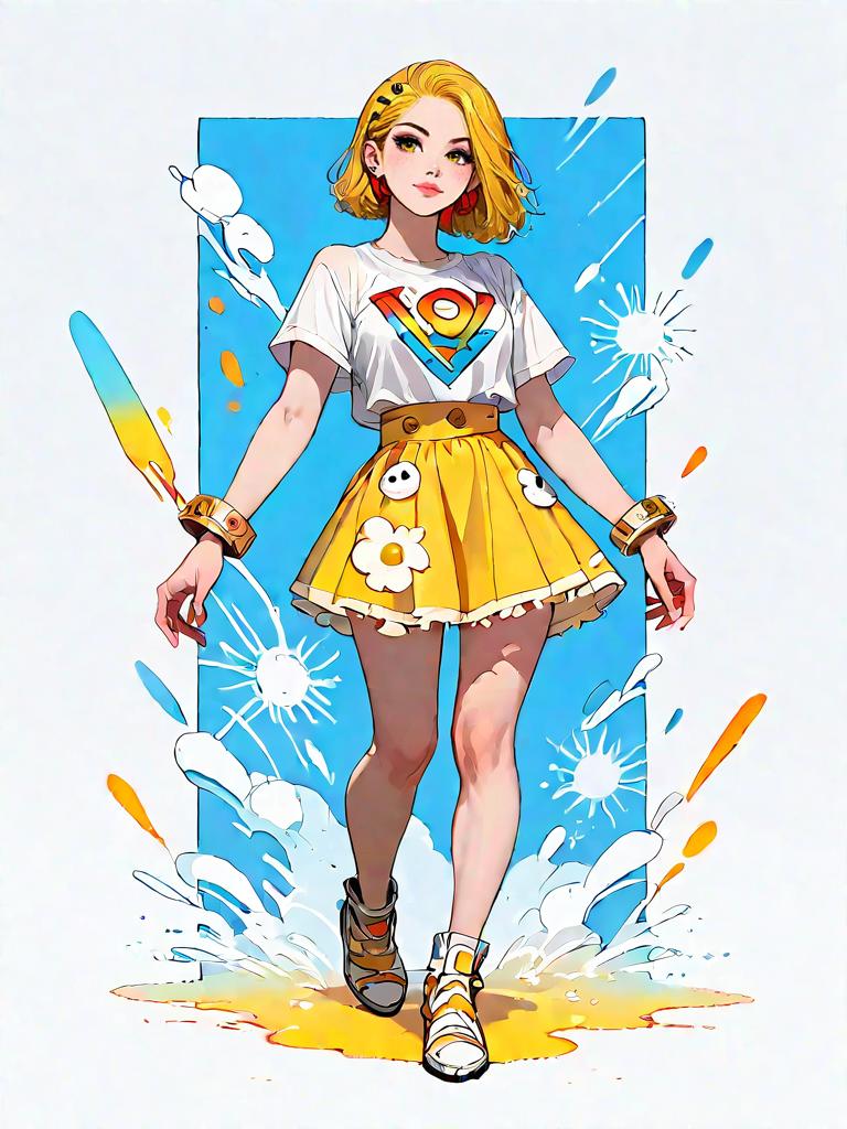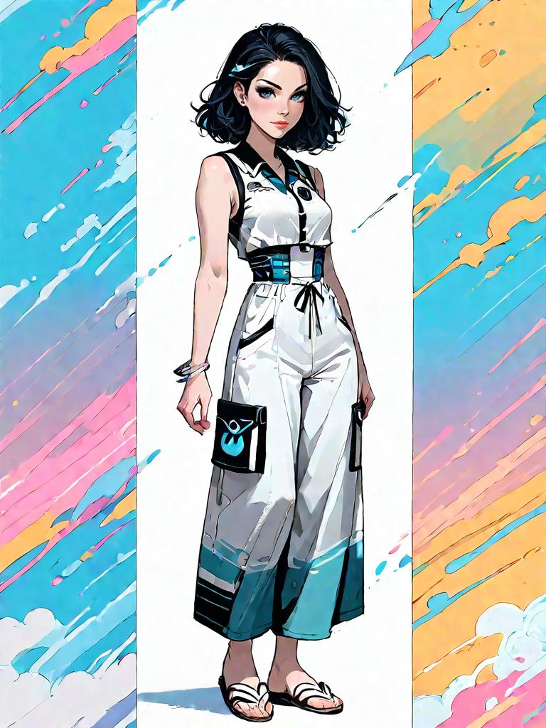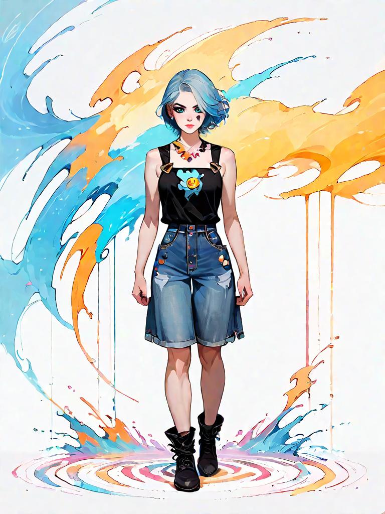 Young Woman in Denim Pinafore Dress with Color Splash Art