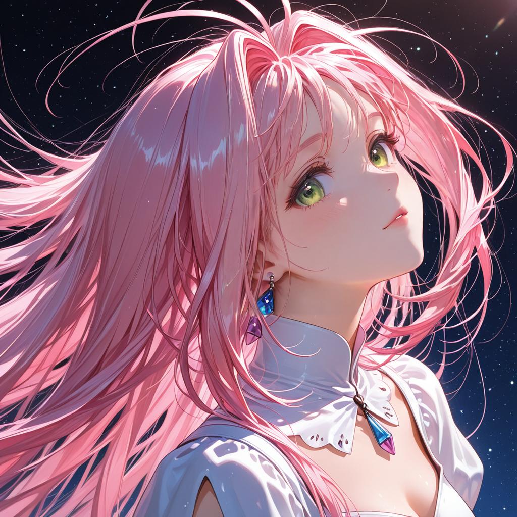 This is a digital anime-style illustration of a young woman with long, flowing pink hair that catches the light, creating a luminous effect. She has large, expressive green eyes and is looking upward with a serene expression. She wears a white high-collared shirt with a blue gemstone pendant and matching blue earrings. The background is a dark, star-filled night sky, adding contrast to her bright hair and clothing. The artwork is highly detailed, with a focus on the character's delicate features and the soft, flowing texture of her hair. The overall composition is dynamic and slightly ethereal.