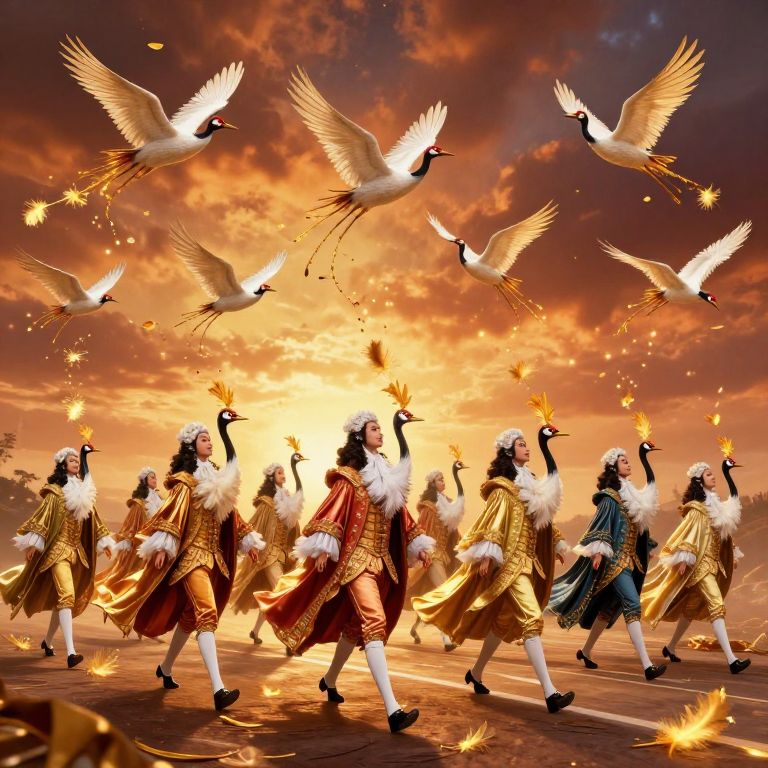 A flock of phoenixes dressed in elaborate 18th-century attire parades across a sky of molten silk, each feather shedding golden feathers that form ephemeral roadmaps.