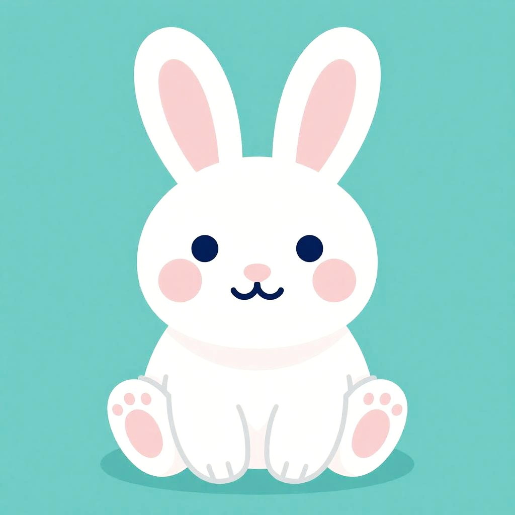 Cute and colorful vector illustration of a rabbit in bright colors on a teal background, using simple shapes and bold lines. No shading or gradients, suitable for screen printing. Vibrant hues with clear outlines for an eye-catching effect, designed for silkscreening, stamp-like gouache style.