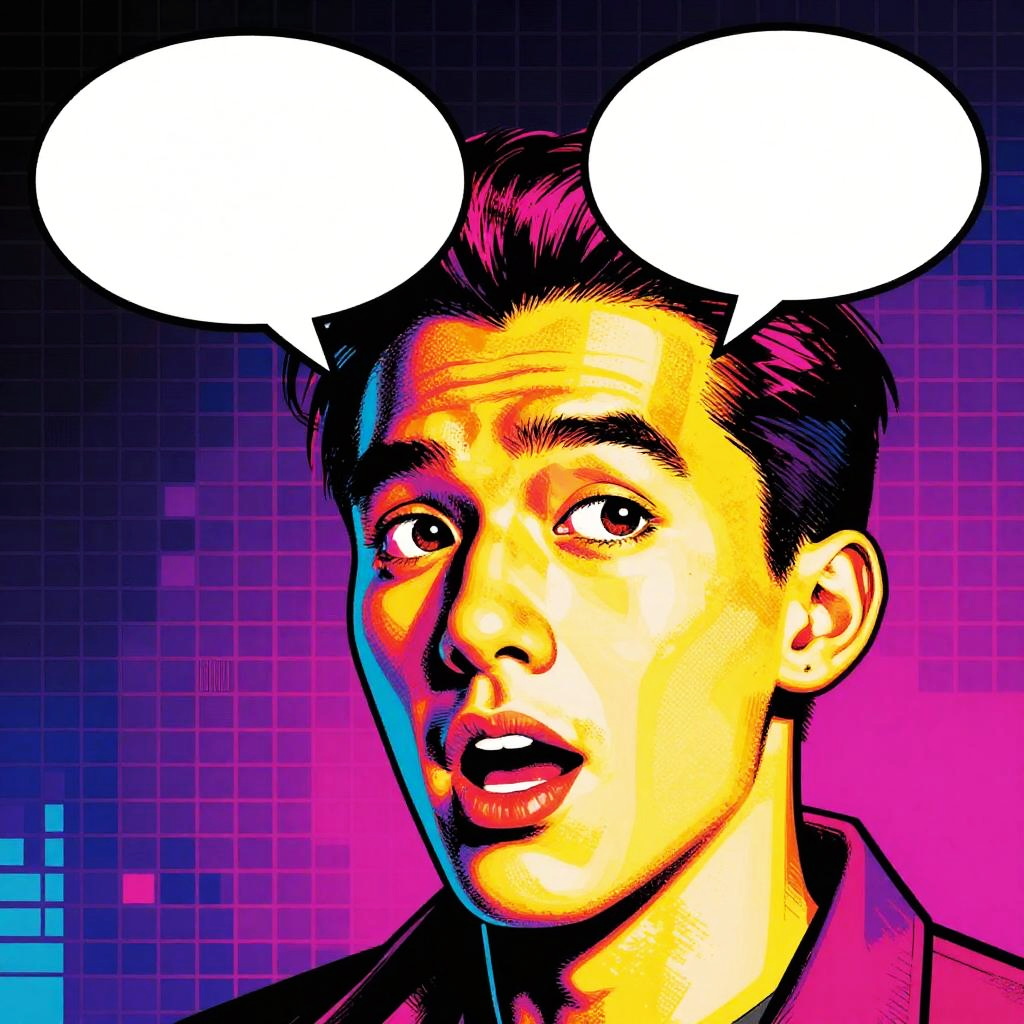Convert image to pop art online in a modern digital style, incorporating exaggerated facial expressions, graphic speech bubbles, and intense neon colors blending into a pixelated grid background, evoking a fusion of classic pop art and cyberpunk aesthetics.