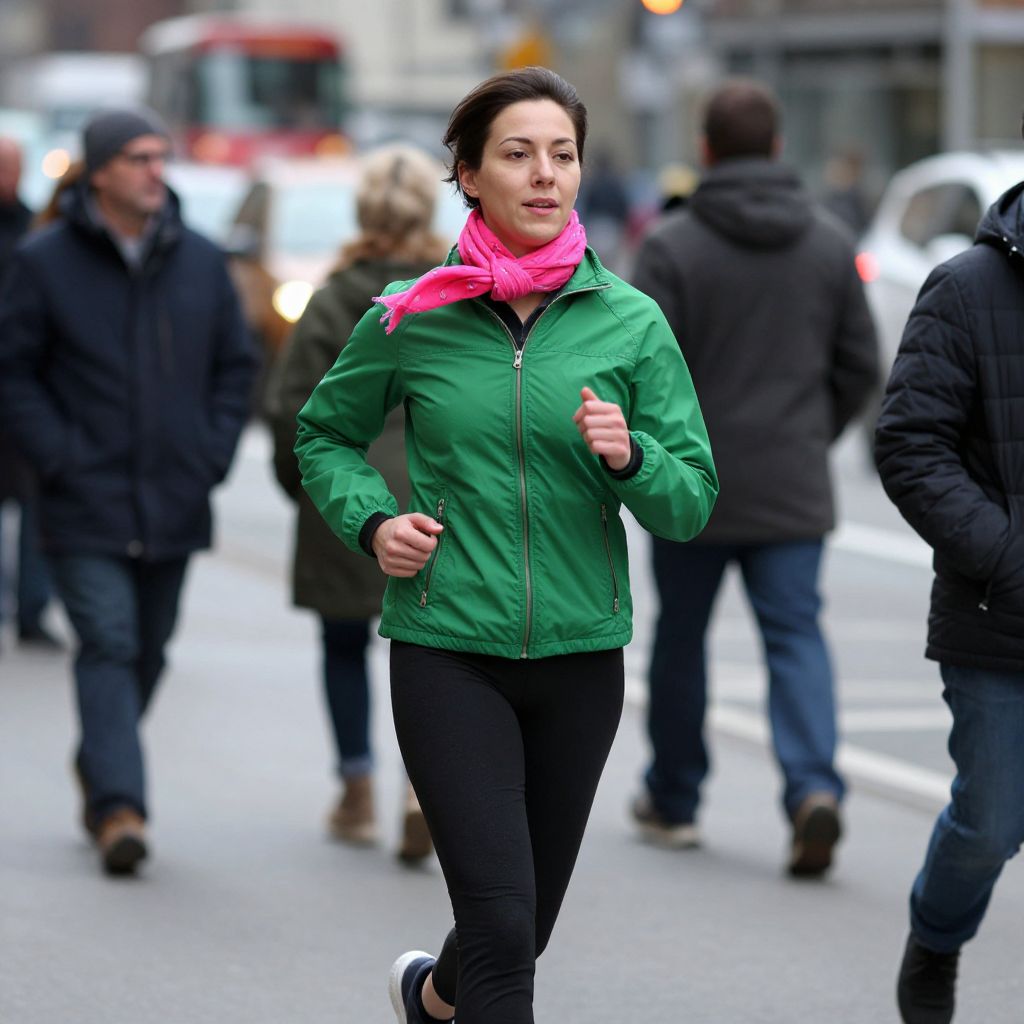 Energetic woman jogging through a bustling city street, her green jacket and vibrant pink scarf contrasting against the urban backdrop as blurred pedestrians and vehicles surround her.