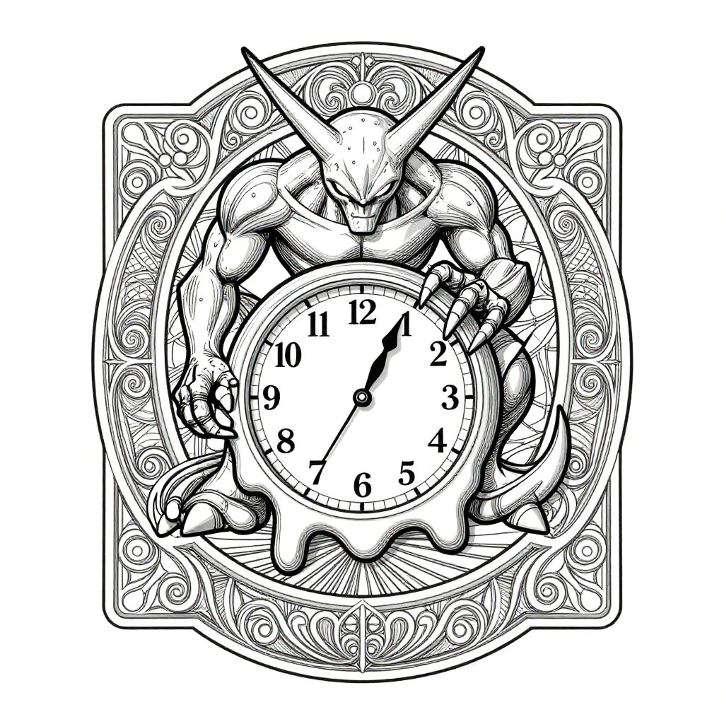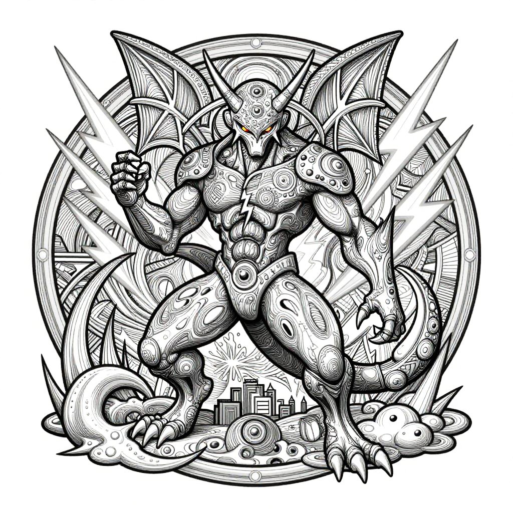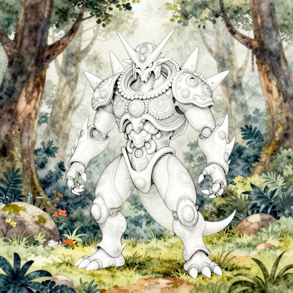 Intricate mewtwo coloring page with watercolor-style detailing, featuring a misty forest