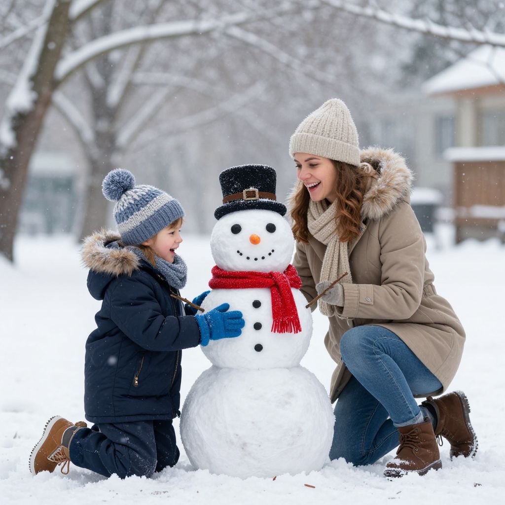In the quiet embrace of winter, a tender bond blossoms as a woman and child collaborate to build a snowman, their laughter echoing through the crisp air, symbolizing the timeless joy of shared moments and the enduring magic of childhood wonder.