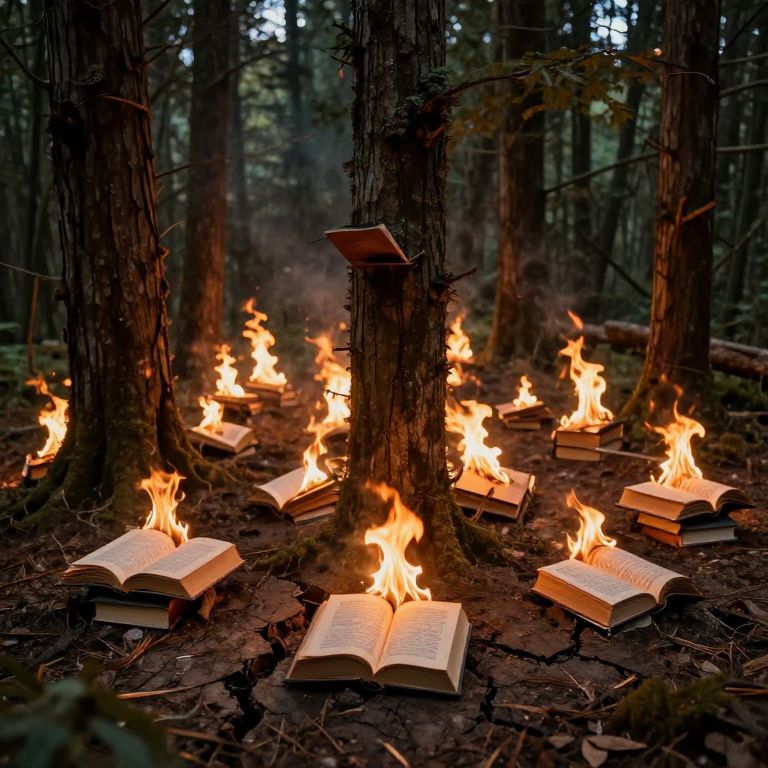 Photograph of a forest scene with open books on fire, flames flickering around tree trunks, creating a mystical, eerie atmosphere.