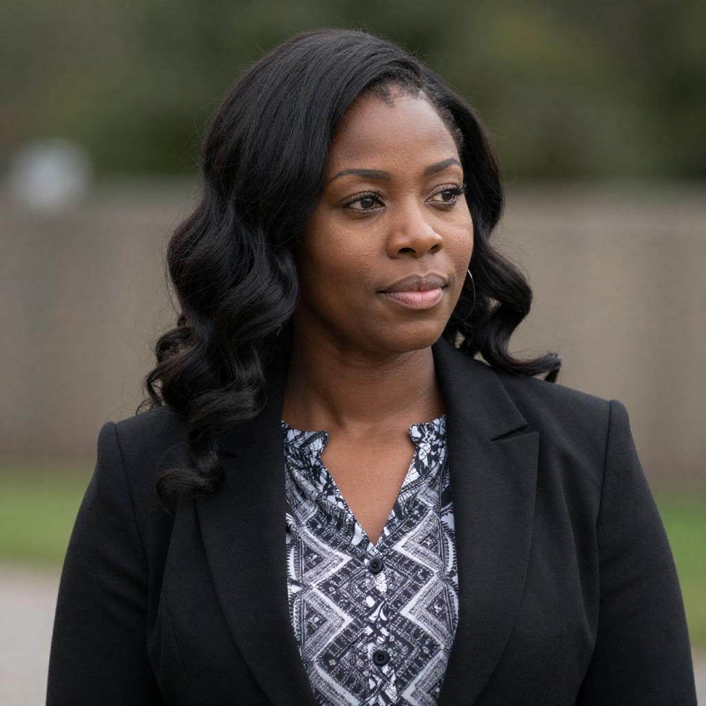 Photograph of a confident black woman with short, styled hair, wearing a black pinstripe suit and black leather gloves. She holds a black revolver in her right hand, raised to shoulder level. Her expression is intense with slightly parted red lips. Background is a blurred, neutral-toned setting. She stands centered, facing forward.