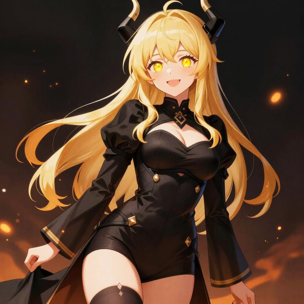 This digital anime-style drawing features a blonde, fair-skinned woman with large, glowing yellow eyes and a playful smile. She has long, wavy hair and wears a black, form-fitting outfit with puffed sleeves, a deep cleavage, and thigh-high stockings. Black horn-like accessories sit on her head. The background is dark with glowing orange particles, adding a dramatic effect. She's posed seductively, looking directly at the viewer.