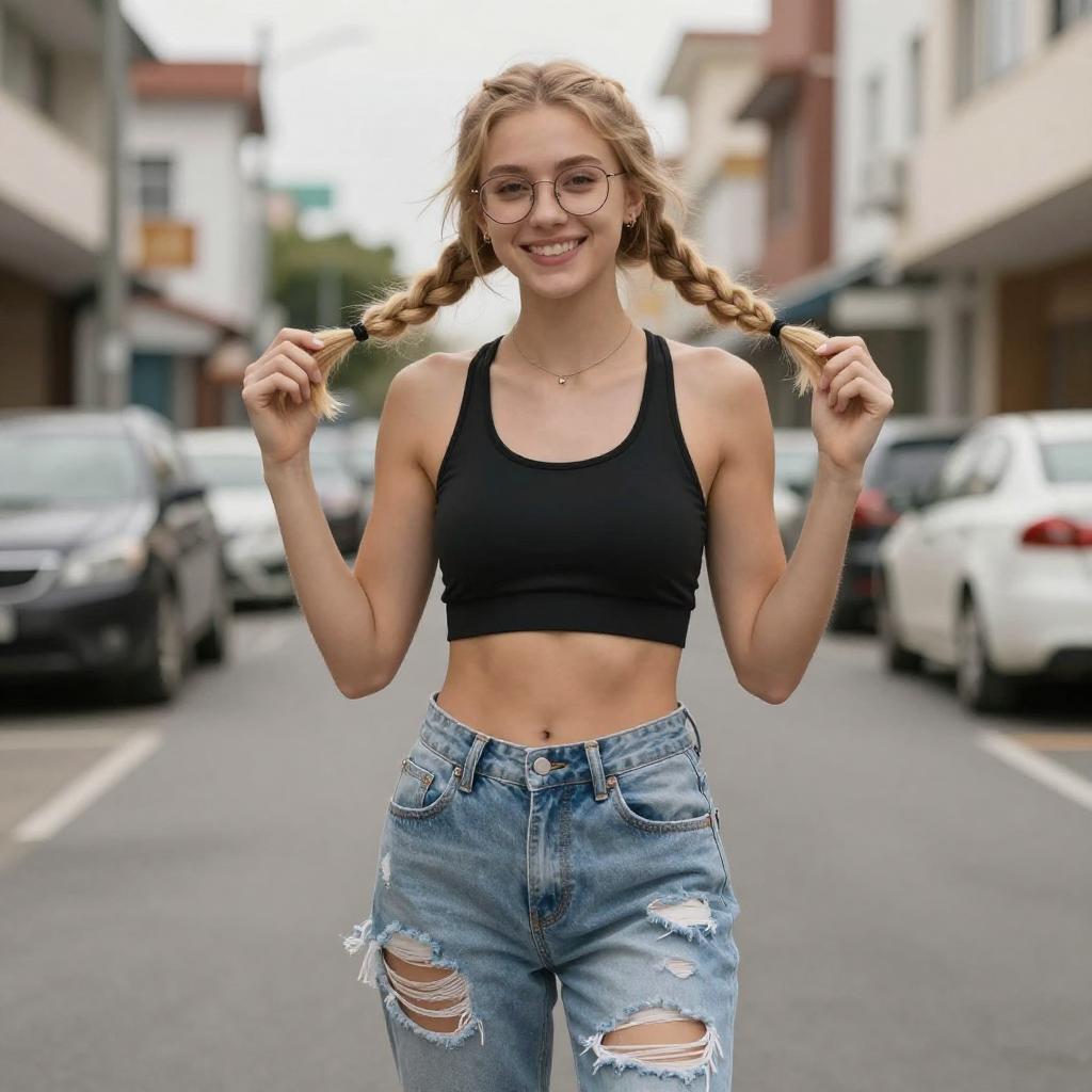 Photograph of a smiling young woman with light skin and blonde hair in two braids, wearing a black sports bra and light blue, ripped jeans. She stands outdoors on a street, holding her braids, with blurred buildings and cars in the background. She has a slim, toned physique and wears glasses.