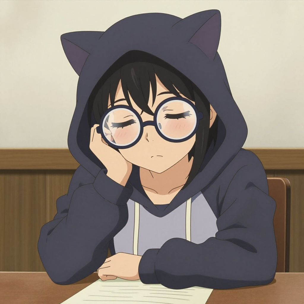 Contest Winner anime style, 30 yr old woman with large glasses with circular rims, wearing a hood with cat ears, she is very tired sitting at a table,