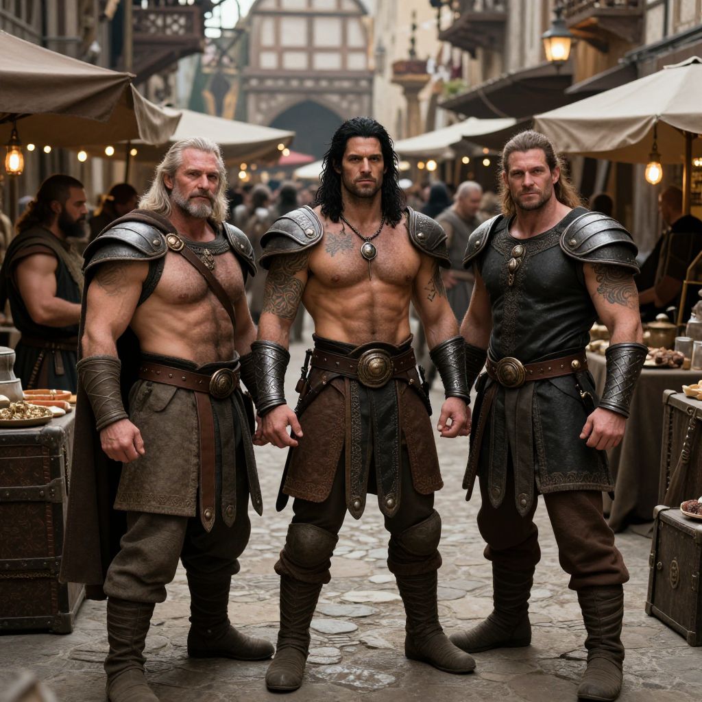 In a medieval market, three hyper-muscular dark-haired androgynous men stand prominently, their bodies adorned with intricate armor that reveals their muscular physiques. The central figure, with a necklace and a tattoo on his arm, exudes an air of strength and confidence. To his left, an older man with a mustache and a cloak adds a sense of wisdom and experience to the scene. On the right, another man in a revealing skin-tight outfit complements the group's diverse yet harmonious appearance. The market is filled with muscular hairy men in trunks, creating a vibrant and dynamic atmosphere. The lighting is cinematic, with warm tones and intricate details that enhance the realism of the scene. The urban setting is rich with textures and patterns, from the worn wooden structures to the bustling crowd, all bathed in the soft glow of street lamps. The overall composition is masterful, with elements arranged in a way that draws the viewer's eye across the scene, from the central figures to the peripheral details, creating a sense of depth and immersion.
