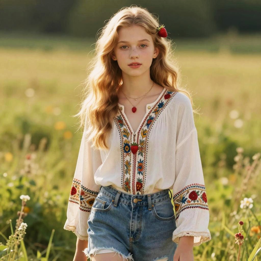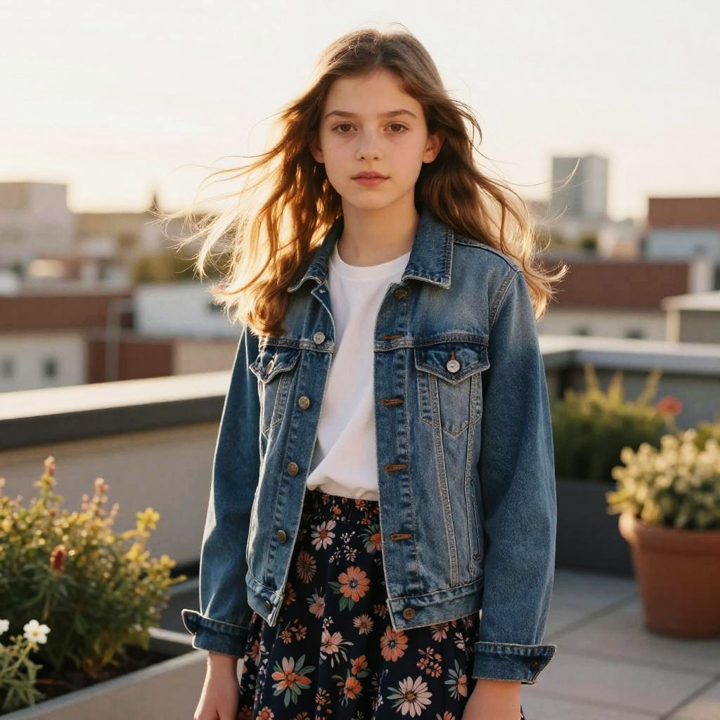 Peekaboo Color hairstyle on teenage girl, wearing denim overalls and t-shirt, in sunlit garden, captured in fashion editorial style with gentle morning sunlight.