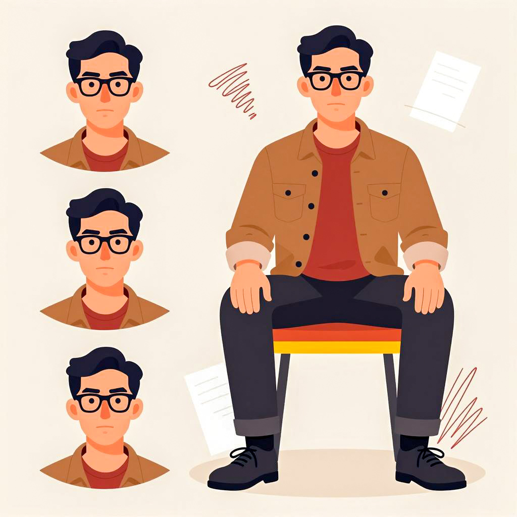 Illustration of a man with short, wavy hair, wearing black-framed glasses and a white shirt, standing in front of a larger, abstract, shadowed version of his face. Background split between beige and red. Man's face is serious, looking slightly downward. He stands with right hand in pocket, left hand by side, wearing dark pants and shoes. Red and beige colors contrast his darker facial shadows.