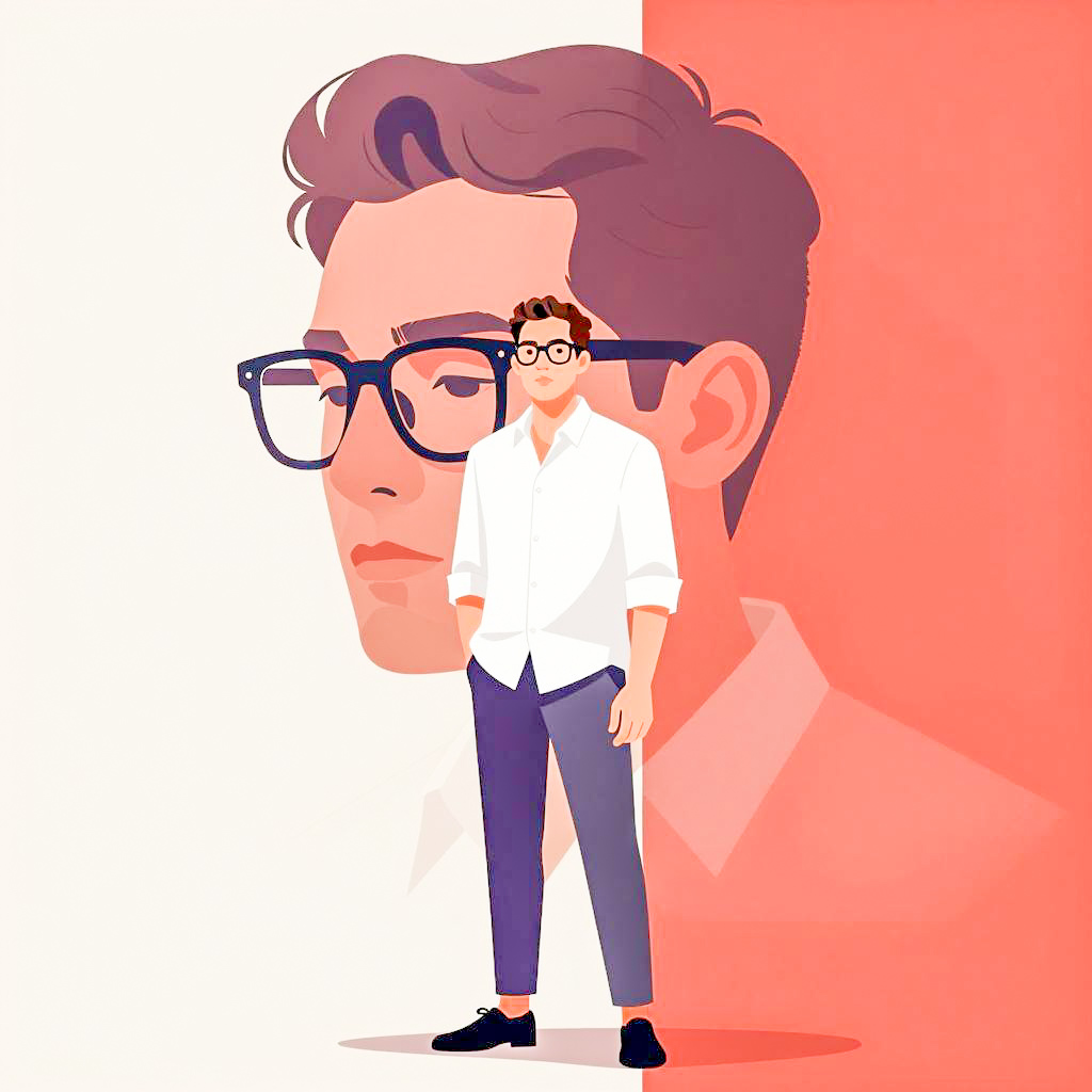 Illustration of a man with short, wavy brown hair and black-framed glasses, wearing a white button-up shirt and dark pants. He stands with a serious expression, right hand in pocket and left hand by his side, in front of a large, abstract, shadowed version of his own face. The background is divided into beige and red sections, creating a contrast with the man's darker facial shadows.
