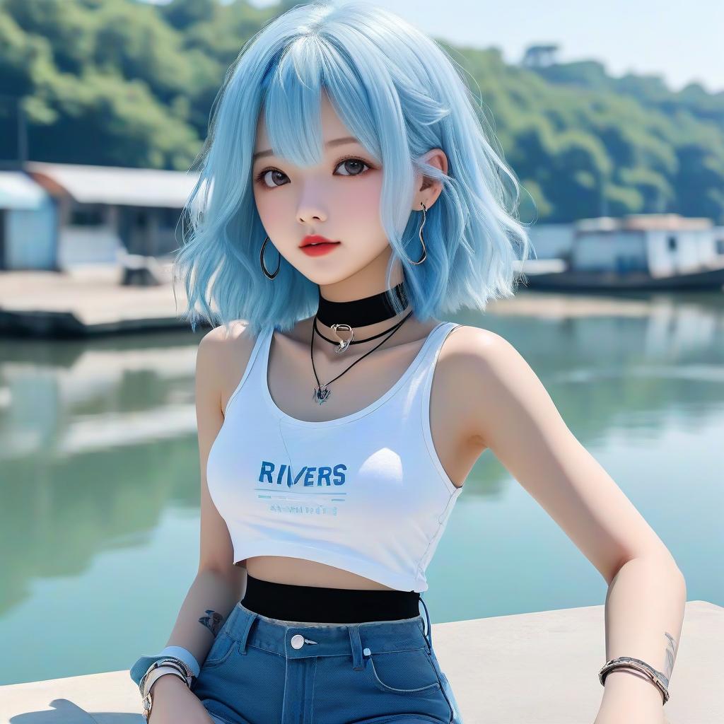 Digital anime-style photograph of a young woman with blue hair, wearing a white "RIVERS" tank top, high-waisted jeans, black ch