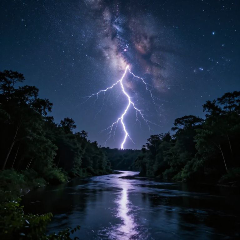 Photograph of a vivid lightning bolt striking over a dark, reflective river, surrounded by silhouetted trees, with a starry, Milky Way