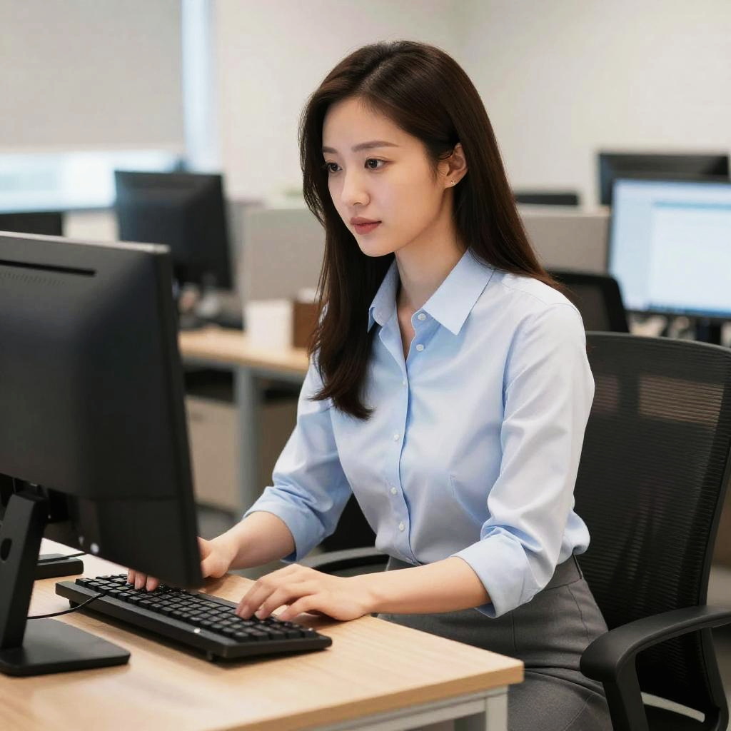 Photorealistic image of a young Asian woman with long dark hair, wearing a light blue button-up shirt and a grey skirt, typing on a keyboard at her desk in a modern office environment. She is focused on her computer screen, sitting on a black mesh office chair, with multiple blurred monitors and office furniture in the background.
