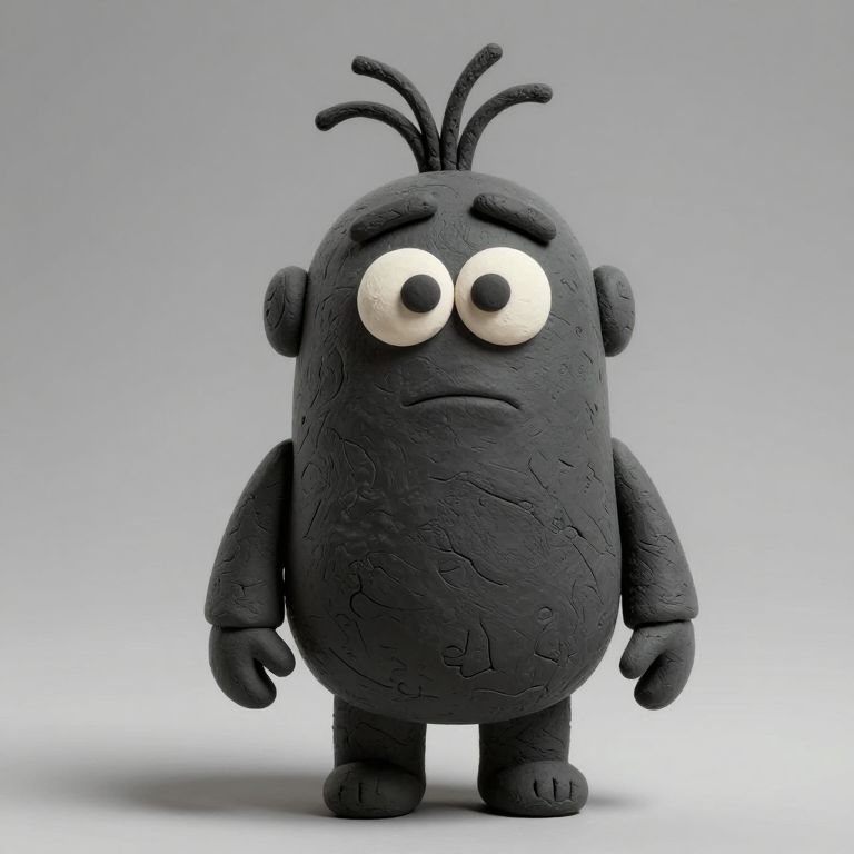 This is a CGI image of a black, textured, cartoon-style character standing against a gradient gray background. The character has a round, plump body, large white eyes with black pupils, and small, downturned eyebrows, giving it a sad or bored expression. It has two short, black, antenna-like protrusions on top of its head, small circular ears on the sides, and simple black hands and feet. The character's surface is slightly rough, resembling a textured, molded material. The overall design is minimalistic with a focus on the character's somber, expressionless face.