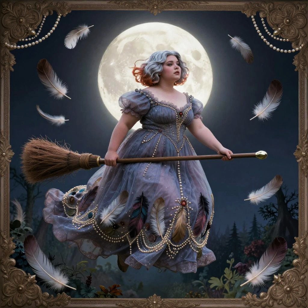 A whimsical, gothic fairytale illustration of a plump and magical woman with asymmetrical waterfall bob with silver-saffron streaks, flying through a surreal night sky on a broom, surrounded by feathers and pearls, in front of a glowing full moon. She wears a voluminous hand-painted twilight chiffon polonaise with embroidered feathers and pearl filigree with delicate lace and ornate details, framed by an elaborate vintage border. The scene is rendered in a highly decorative style with muted jewel tones and a mystical forest below.
