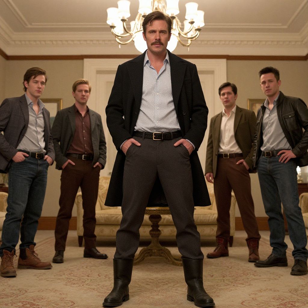 Photograph of a man with a rugged, handsome appearance standing confidently in the center of a luxurious living room. He has short, dark hair, a trimmed beard, and is wearing a black, knee-length coat over a white, slightly unbuttoned dress shirt, black pants, and black boots. His hands are in his pockets. Four men stand behind him, wearing casual to semi-formal attire including button-down shirts, jackets, and jeans. The background features an elegant chandelier, cream-colored walls with crown molding, and a patterned carpet. The men's expressions are serious, and the room is warmly lit.