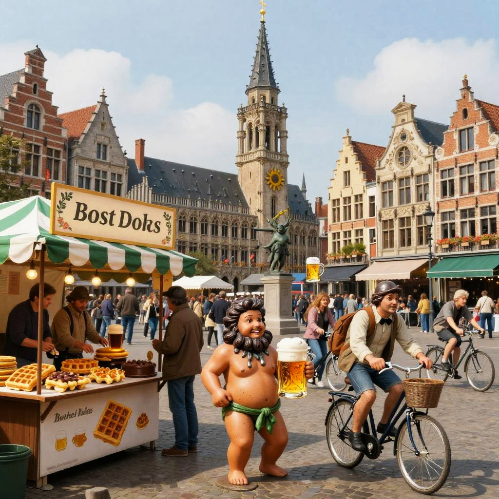 Belgian stereotypes depicted through a detailed digital painting of a lively beer festival, waffles and chocolate stalls, iconic Manneken Pis statue, and cyclists racing past historic European buildings.