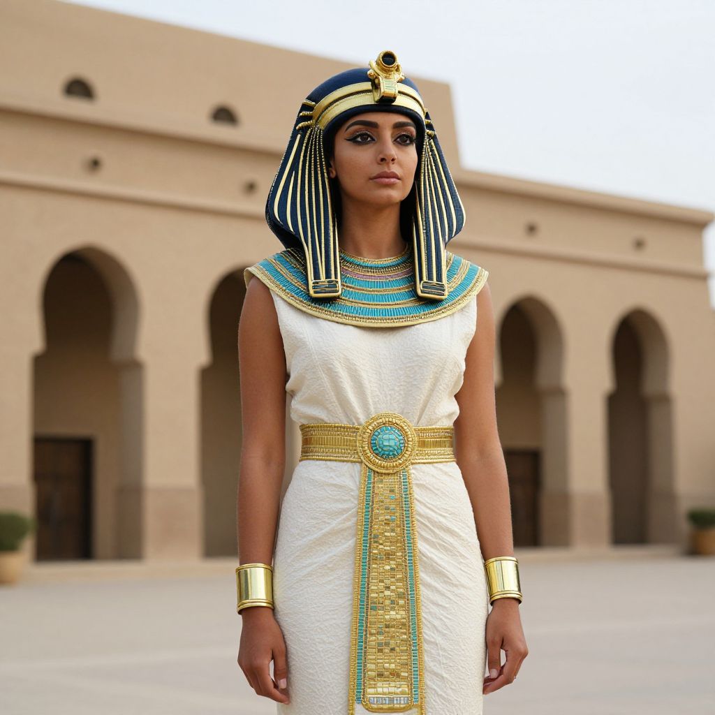 Photograph of a Black woman dressed as an ancient Egyptian pharaoh. She wears a white, sleeveless linen dress adorned with gold and turquoise accents, including a wide, gold belt with a turquoise stone. She has a blue and gold striped headdress with a pharaoh's cobra emblem, gold armlets, and a turquoise necklace. Her expression is serious, with dark, dramatic eye makeup. The background features a beige, arched building with multiple doorways. The image has a realistic, slightly stylized aesthetic, emphasizing historical accuracy and cultural representation.