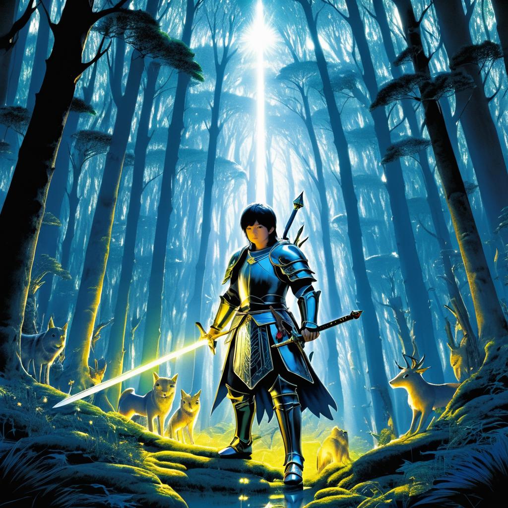 A brave young knight clad in detailed blue and gold armor stands firmly in an ancient, mystical forest. He holds a shining sword emitting radiant light, surrounded by various mystical creatures including white stags, wolves, and horses. The scene is illuminated with ethereal blue and golden hues, rendered in the nostalgic and detailed manga style reminiscent of Shinji Nagashima.