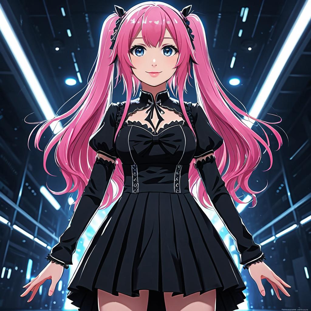 Digital anime-style drawing of a red-haired girl with black bows, wearing a black, low-cut nightgown, sitting cross-legged, eyes closed,