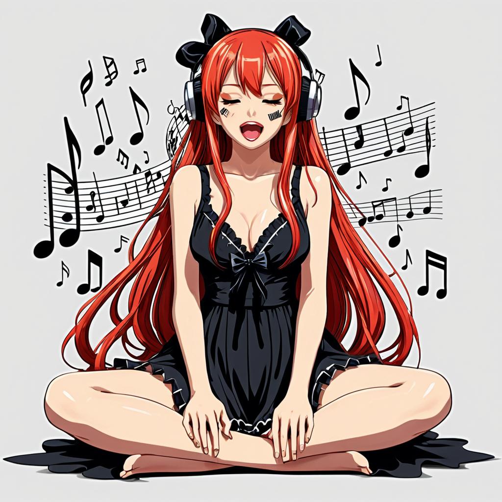 This digital anime-style drawing features a red-haired girl with long, flowing hair and black ribbon hair ties, sitting cross-legged with her eyes closed and mouth open as if singing. She wears a black, semi-sheer, sleeveless nightgown with a bow in the center, revealing ample cleavage. Black musical notes and staff lines surround her, emphasizing the musical theme. Her skin is fair, and her expression is joyful. The background is plain white, making her and the musical elements stand out prominently. The overall style is vibrant and colorful, with a focus on expressive, dynamic lines and shading.