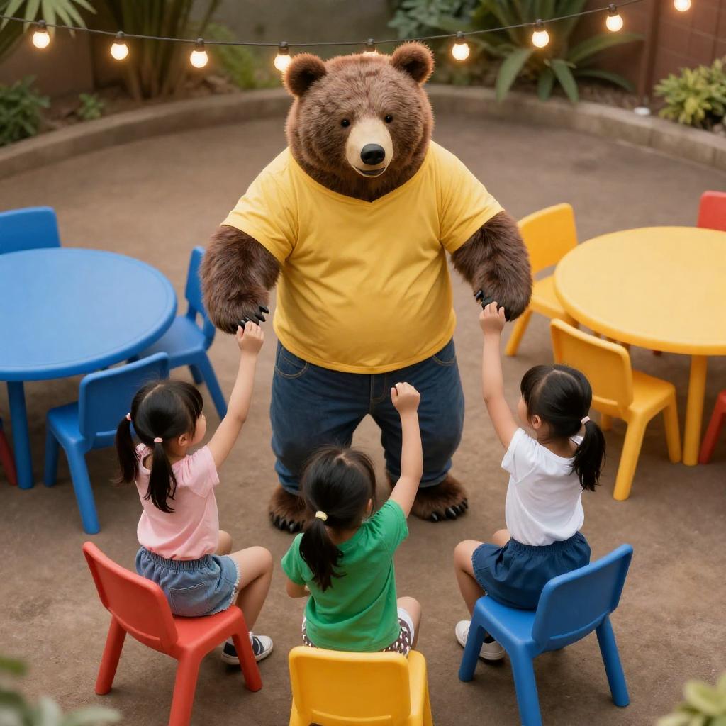 Overhead photograph of three children dancing with an adult bear. The bear wears a yellow shirt and blue jeans, holds one child's hand, and raises the other's hand. Four small tables with colorful plastic chairs are around them. String lights illuminate the scene. The children wear colorful clothes. One child has pigtails, another wears a green shirt, and the third has a polka dot outfit. The bear's facial expression is joyful. The background includes greenery and a brown ground.