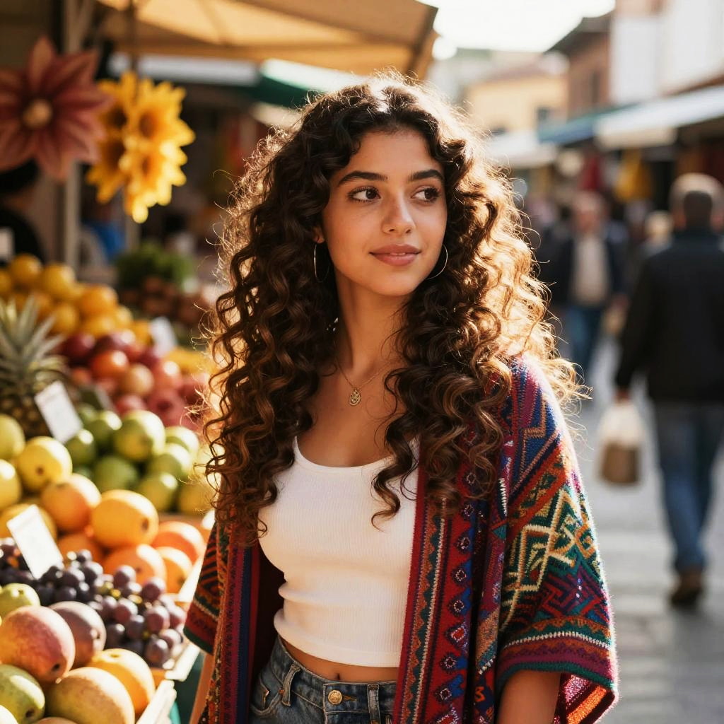 Wavy hair Spanish woman, sunlit Mediterranean background, vibrant traditional dress, soft natural curls flowing in the breeze, warm earthy tones, intricate lace details