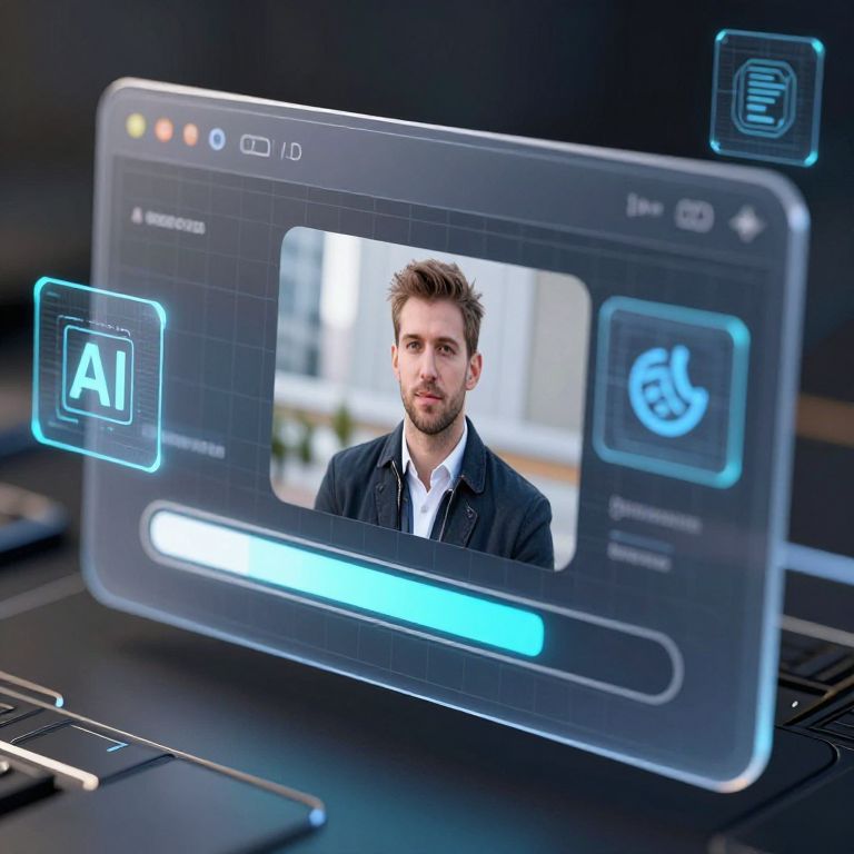 Photograph of a digital interface displaying a semi-transparent, futuristic tablet screen hovering over a laptop. The tablet screen shows a young, attractive Caucasian man with short brown hair and a beard, wearing a dark blue blazer over a white shirt. The screen features a blue glow around the image and includes icons: "AI" on the left, a fingerprint on the right, and a horizontal blue bar at the bottom. The background is blurred, focusing on the digital interface. The overall style is modern and tech-savvy.