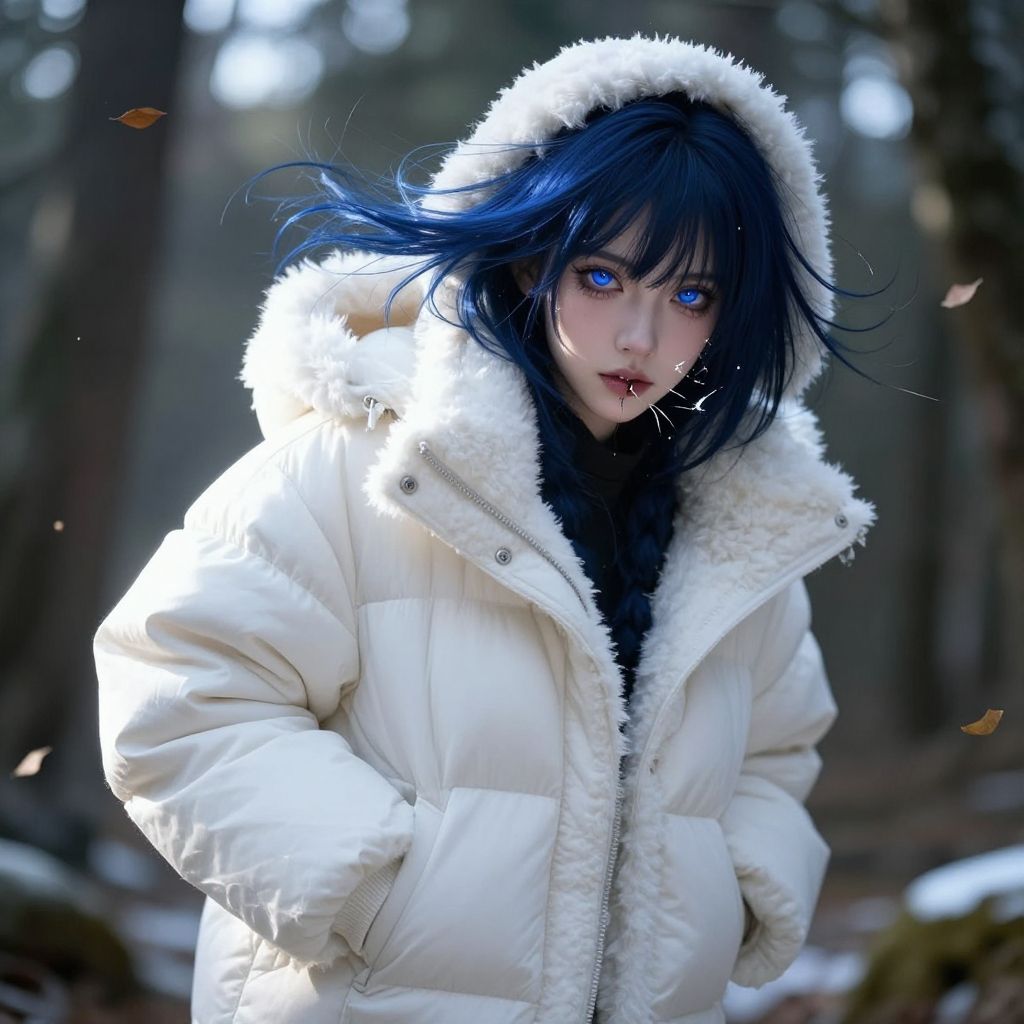 ((((white Oversized shearling padded down jacket)))), ((((white Oversized shearling padded puffer jacket)))), ((((white Oversized shearling padded down coat)))), ((((white Oversized shearling padded puffer coat)))), ((((Oversized shearling padded winter clothes)))), ((((very very cold)))), ((((puffer hood))), (((outdoors, forest, winter, daytime, sunlight))), dominatrix, ((extremely detailed CG unity 8k wallpaper)), masterpiece, best quality, ultra-detailed, best shadow, ((detailed background)), ((beautiful detailed face)), beautiful detailed eyes, High contrast, ((best illumination)), an extremely delicate and beautiful), ((((cinematic light)))), colorful, hyper detail, ((illustration)), floating, dramatic light, intricate details, ((1 girl)), solo, (blue sky eyes, sharp eye, eyeliner, eyelashes, sharp face), dark blue hair, hair between eyes, earrings, swirling leaf around the character, ((depth of field bloom)), glowing eyes, broken glass, mole under mouth, (Thick padded cuffs:1.4), (Thick padded collar:1.4), (TSH:1.4)