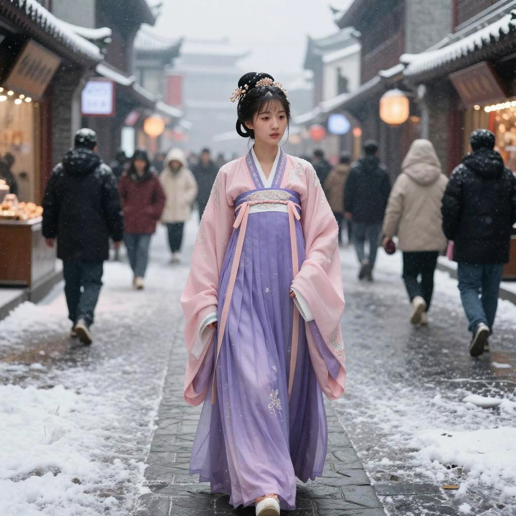 (RAW photo, best quality), (realistic, photo-realistic:1.3), extremely delicate and beautiful, Amazing, finely detail, masterpiece, ultra-detailed, highres, (best illustration), (best shadow), intricate, On a snow storm night, a beautiful Chinese girl stands on the street corner amidst bustling shops and rushing crowds. sharp focus, volumetric fog, 8k UHD, DSLR, high quality, (film grain:1.4), Fujifilm XT3, solo, (hanfu, tang style outfits, pink upper shan, purple chest pleated skirt, purple with white waistband, purple pibo)