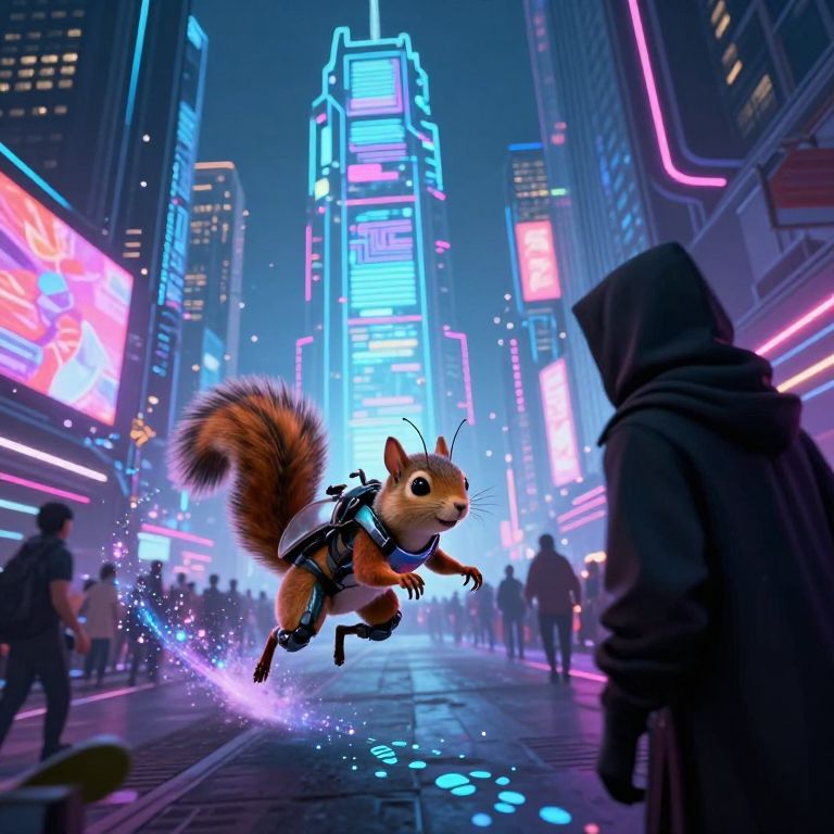 In this hyper-realistic, A24-style movie poster, a giant squirrel, adorned with a futuristic harness, is playfully attacking Manhattan. The squirrel, with its fiery battle stance, is positioned in the foreground, its fur a vibrant mix of red and orange hues. Behind it, a dramatic explosion rips through the cityscape, casting a fiery glow that contrasts with the dark, towering buildings. Fighter jets streak through the sky, adding to the chaotic atmosphere. The A-Team van, a symbol of action and adventure, is visible in the background, partially obscured by the chaos. The overall composition is intense and dynamic, with a sense of dramatic depth of field that draws the viewer into the scene. The interplay of colors, textures, and shapes creates a visually striking and immersive experience, capturing the epic and destructive nature of the battle.