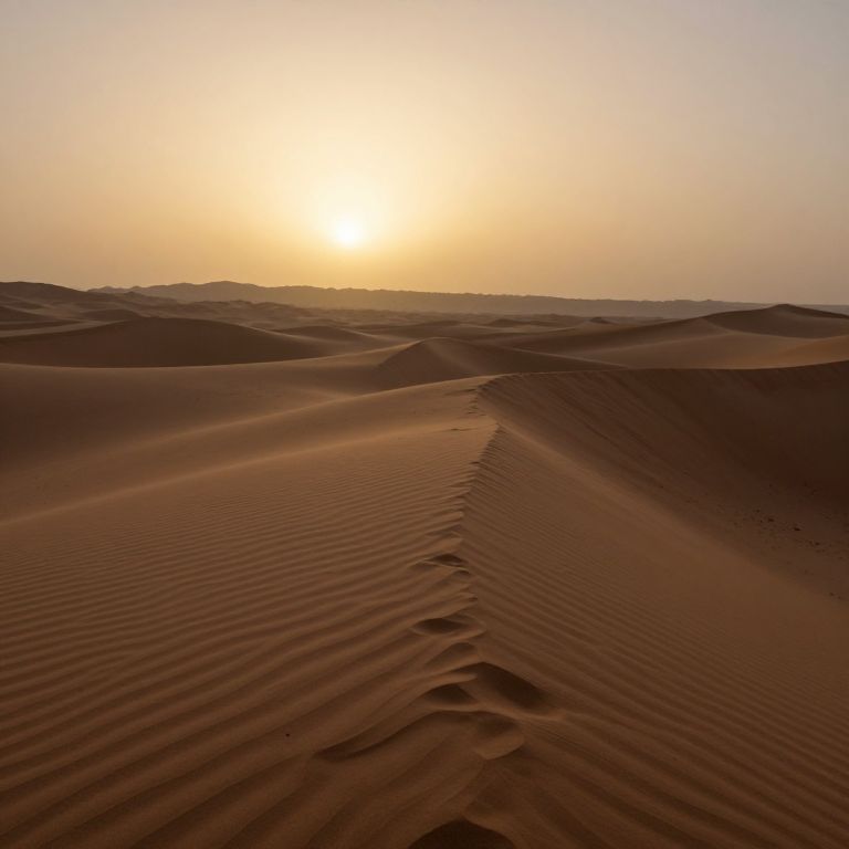 Photograph of a vast desert landscape at sunset. The sun, a bright golden orb, sits low on the horizon, casting a warm, orange glow across the sky and sand dunes. The desert is covered in undulating, rippled sand with distinct, parallel ridges. The sand is a rich, reddish-brown color, creating a striking contrast against the soft, golden light of the setting sun. The sky is clear with a faint gradient from yellow near the horizon to pale blue at the top. The overall scene evokes a sense of tranquility and vastness.