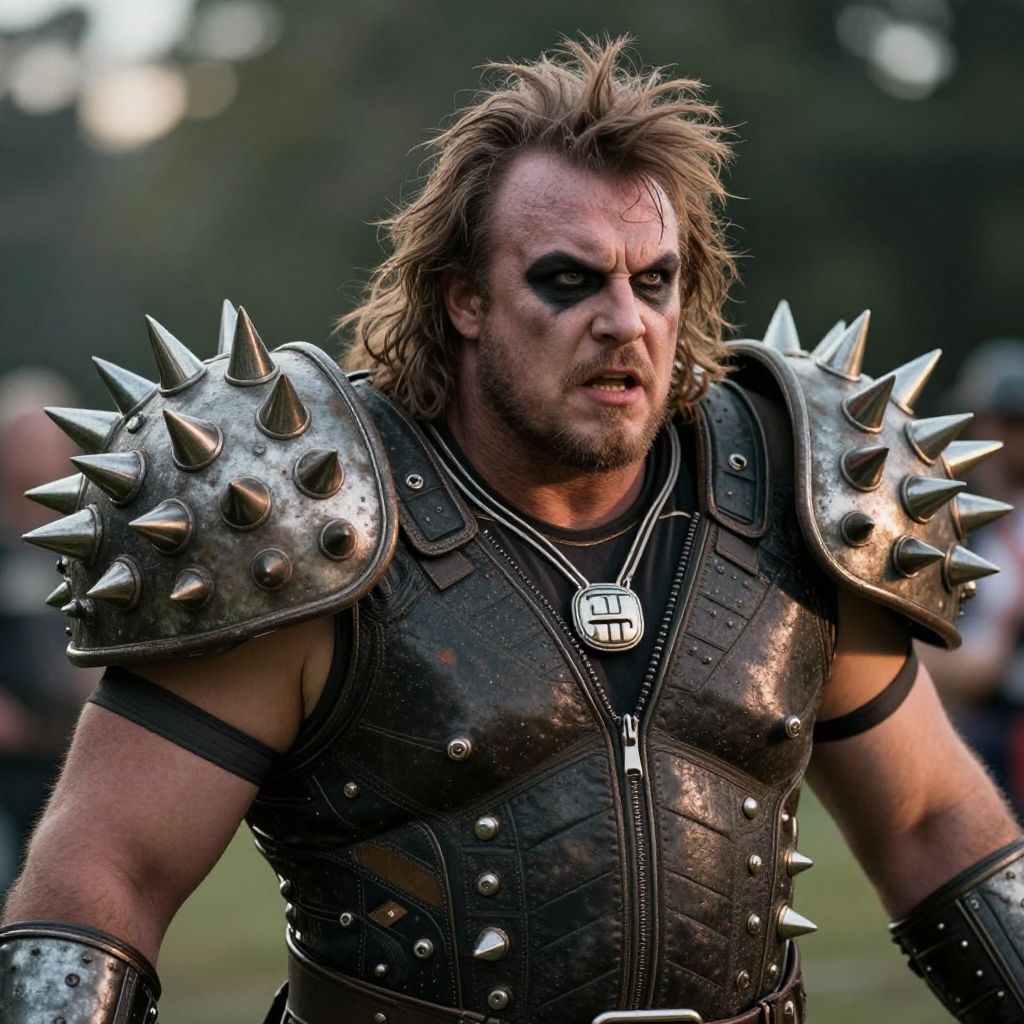 Photograph of a rugged, muscular man with messy brown hair, wearing spiked black leather armor, dark makeup, and a dog tag necklace, standing in