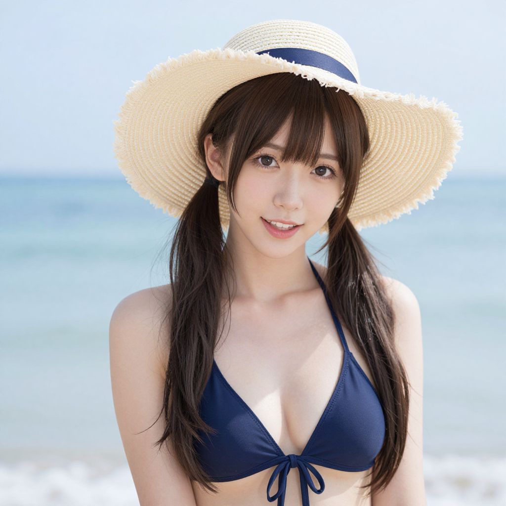 Photograph of a young Asian woman standing on a beach. She has fair skin, long black hair in pigtails, and is wearing a wide-brimmed straw hat with a blue ribbon. Her dark blue bikini top ties at the center of her chest, highlighting her medium-sized breasts. She has large, dark eyes and a slight smile. The background is a blurred, bright blue ocean. She is wearing gold, circular earrings. The image has a bright and sunny ambiance.