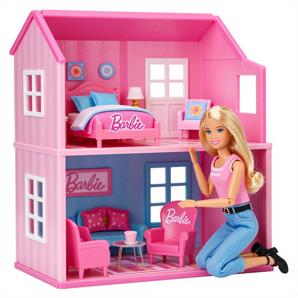 Digital illustration of a blonde Barbie doll in a striped shirt and shorts, kneeling in front of a pink, two-story dollhouse.