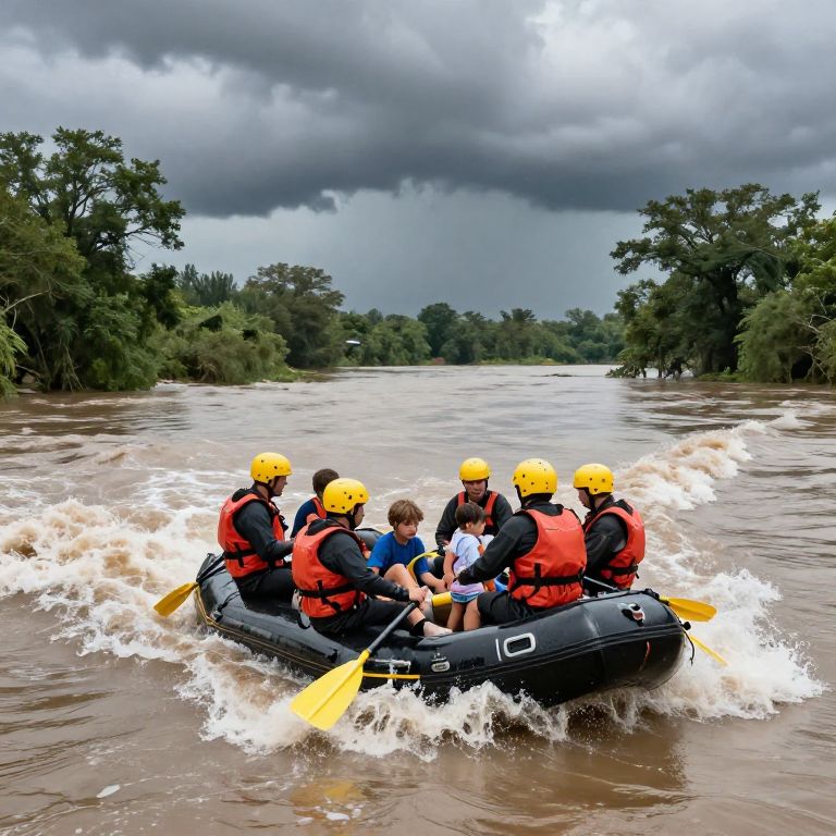 A team of rescuers in rubber rafts navigating through fast-moving floodwaters to reach a stranded family, as storm clouds loom in the distance.