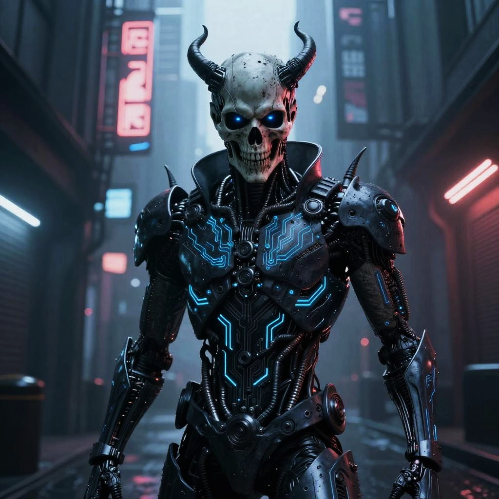 Vampire AI depicted as a futuristic humanoid with glowing red eyes and sleek metallic features, immersed in a dark cyberpunk cityscape with neon lights and ominous shadows, blending gothic horror and advanced technology in a night setting.