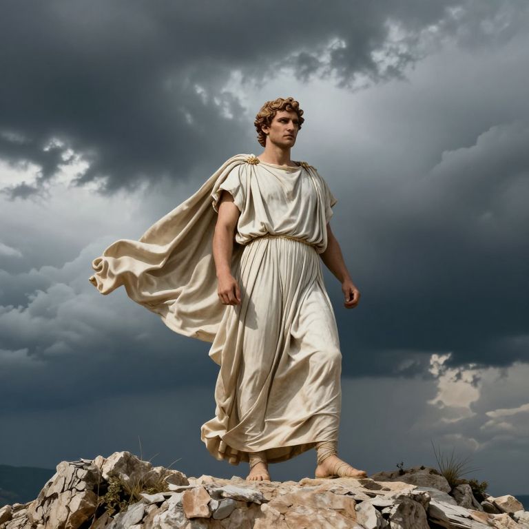 Photograph of a young man with curly brown hair standing on a rocky outcrop under a dramatic, cloudy sky. He wears a flowing, white, ancient Greek-style toga with a draped cape, and is barefoot with a bandage on his right foot. His expression is determined and he stands with a slight forward lean, one hand resting on his hip. The rocky terrain is jagged, with small tufts of grass. The lighting highlights the texture of the toga and his muscular build, casting shadows that emphasize the dramatic clouds behind him.