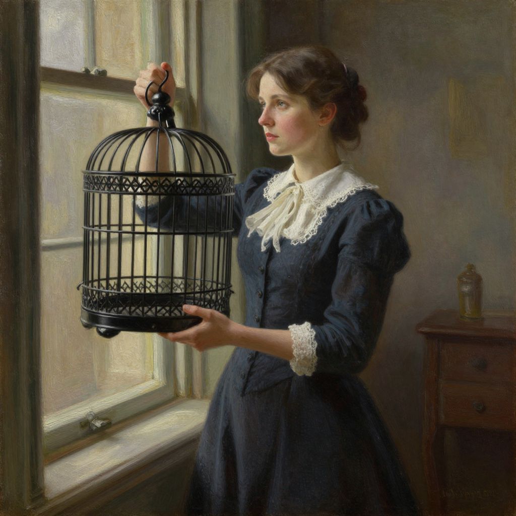 Victorian-era woman in dark blue dress with white lace collar, holding black birdcage by window, sunlight illuminating her profile.
