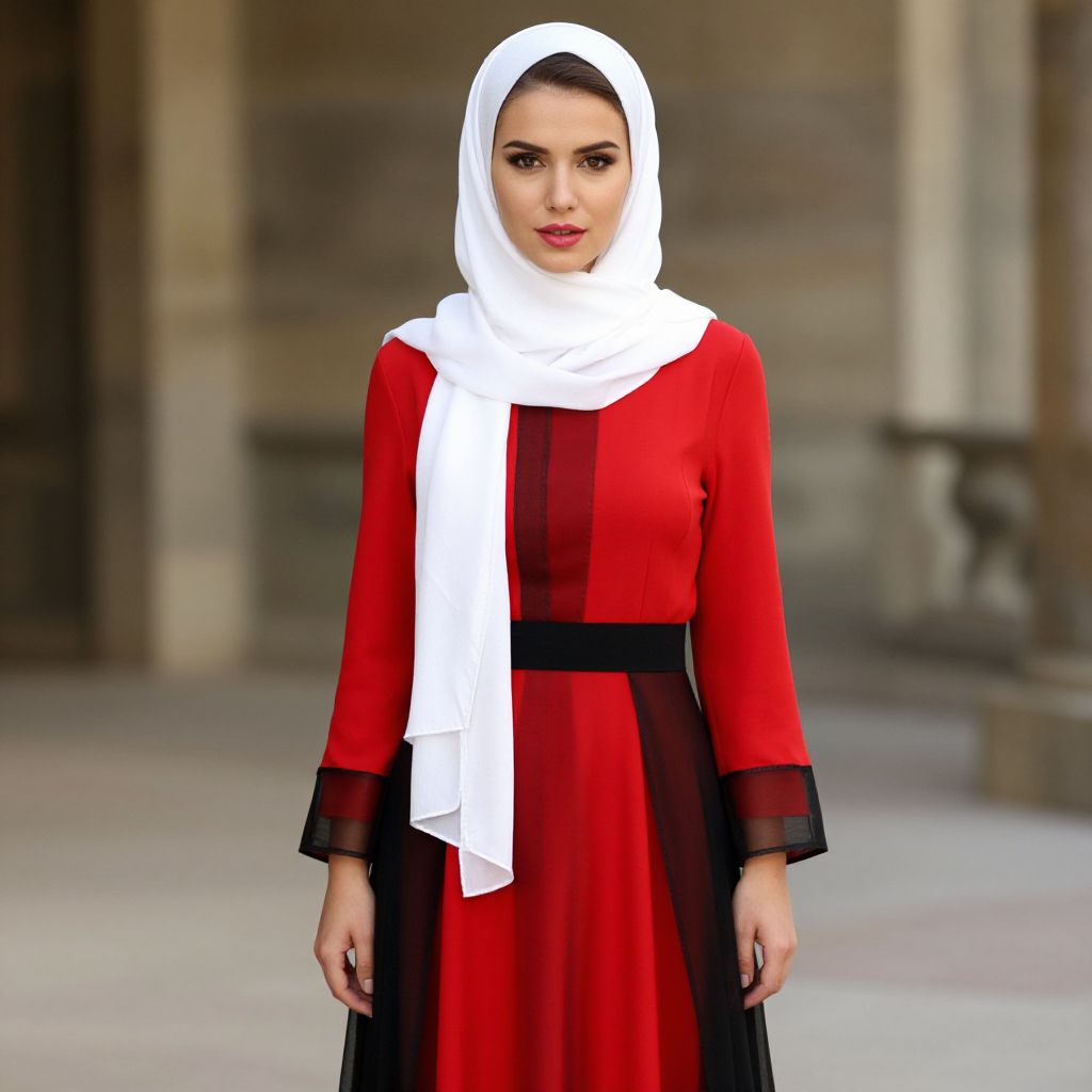 "Adult Family Costume, woman in a red and black dress with a white head scarf"