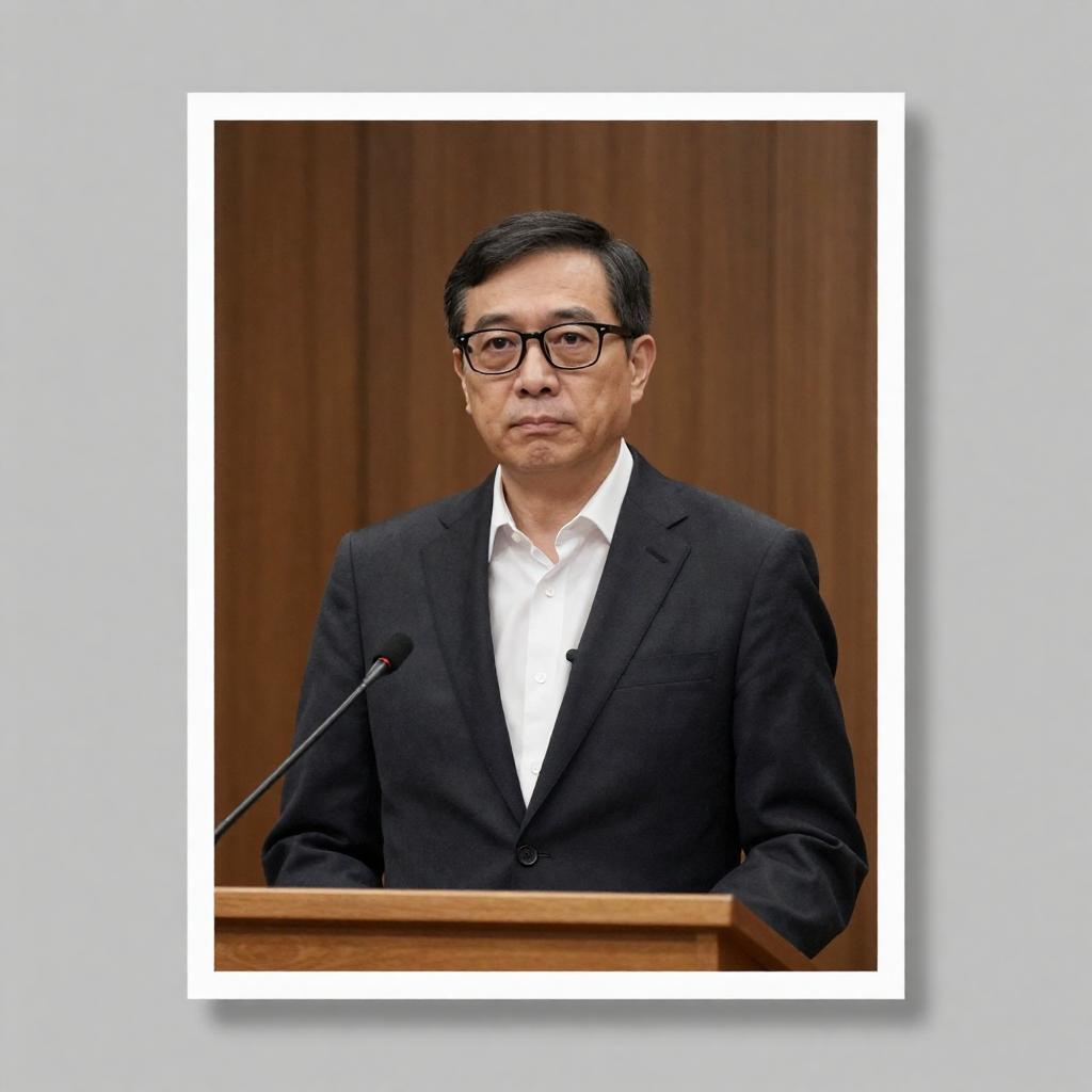 Photograph of a middle-aged man with glasses, wearing a dark suit and white shirt, standing behind a wooden podium with a microphone. He has a serious expression. Brown wooden background. Single person. Gray border. "MovieStillDB.com" .