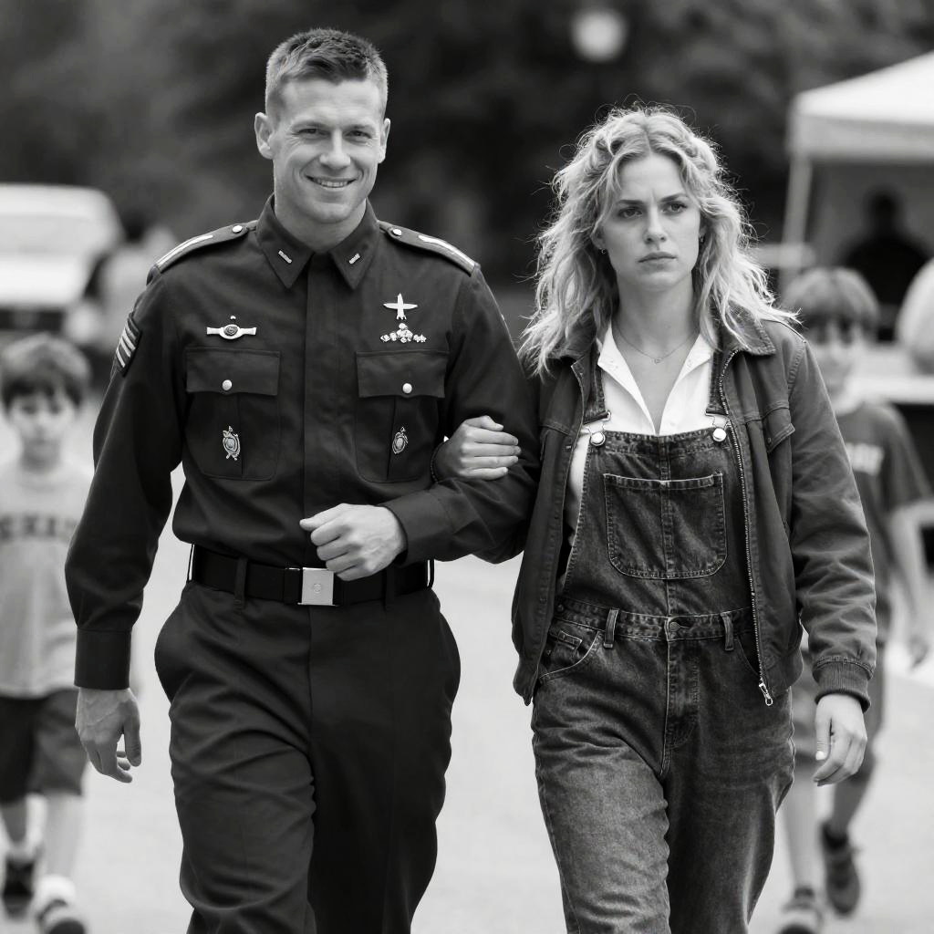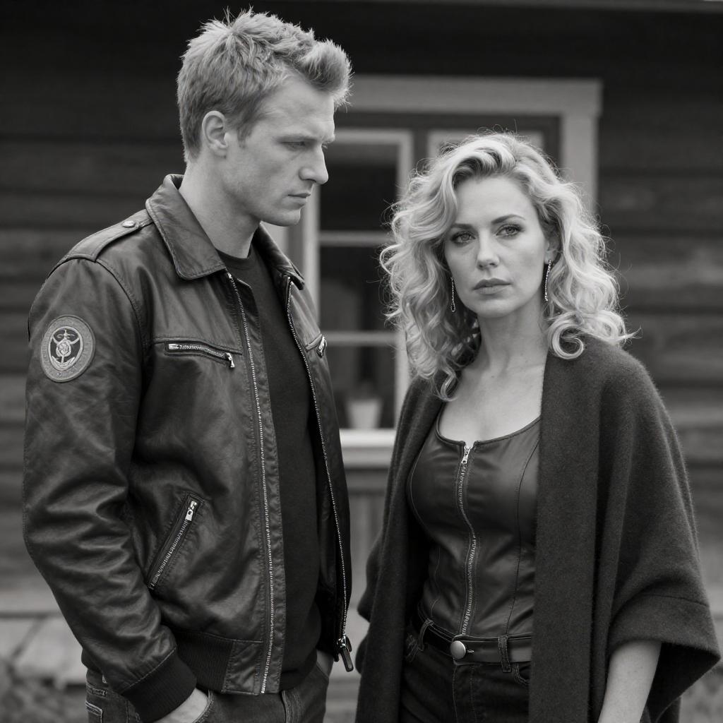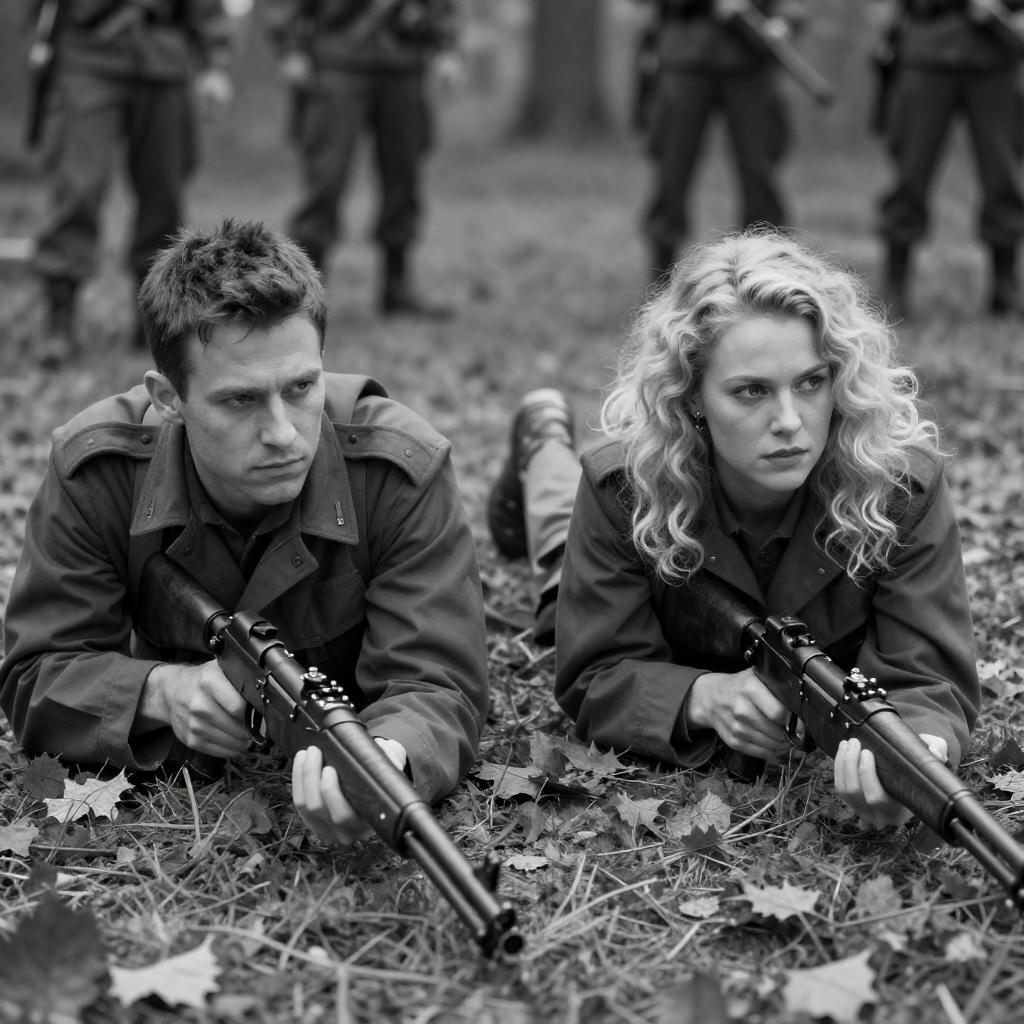 Black-and-white photograph of a man and woman lying prone on a leaf-covered forest floor, both holding rifles. The man, with dark hair and a serious expression, is on the left, while the woman, with curly blonde hair and a focused look, is on the right. Both wear dark military-style clothing. A blurred group of soldiers in the background.