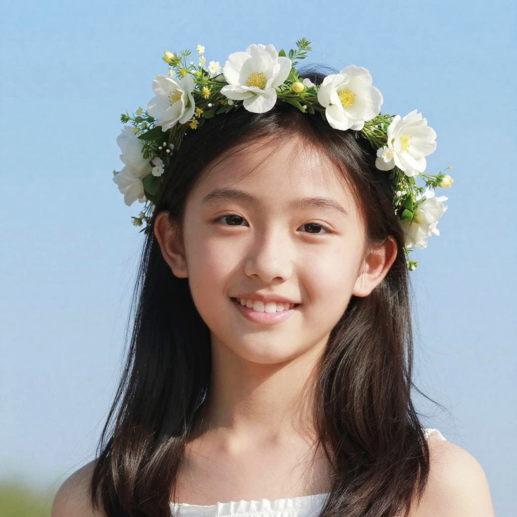 Photograph of an Asian girl with long, straight black hair, smiling softly. She wears a light pink, short-sleeved t-shirt. The background shows a rooftop with a white railing, potted plants with colorful flowers, and blurred buildings with red roofs. The sky is overcast, creating a soft, diffused light. The girl's smooth skin and gentle expression convey a calm and pleasant demeanor. The overall composition is balanced, with the girl centered and the background slightly out of focus.